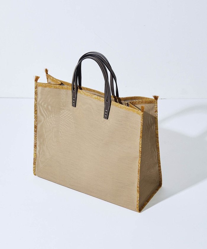 上品な柄をあしらった「ア ヴァケーション」の定番モデル”TANK”。生地は耐久性に優れ、ハンドル部分は二股にくり抜くことでスッキリと細くなり、女性の華奢な手でも持ちやすいデザインに。マチをたっぷりとった大きめのサイジングで、荷物が多いデイリーやお出かけ、ご旅行時など幅広いシーンに大活躍の予感。