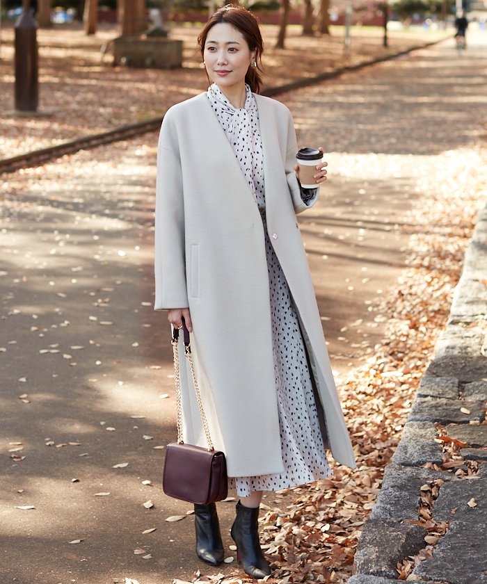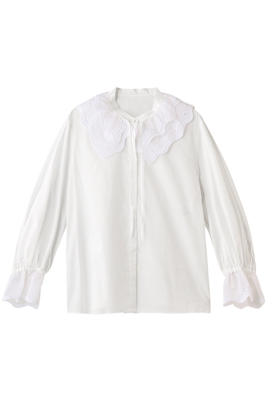 襟と袖口に刺繍を施したトレンドのビッグカラーがデザインポイント。甘くなり過ぎないよう第一ボタンは開けて着用したら大人な印象に。紐リボンは結ばずそのまま垂らした着こなしがおすすめ。