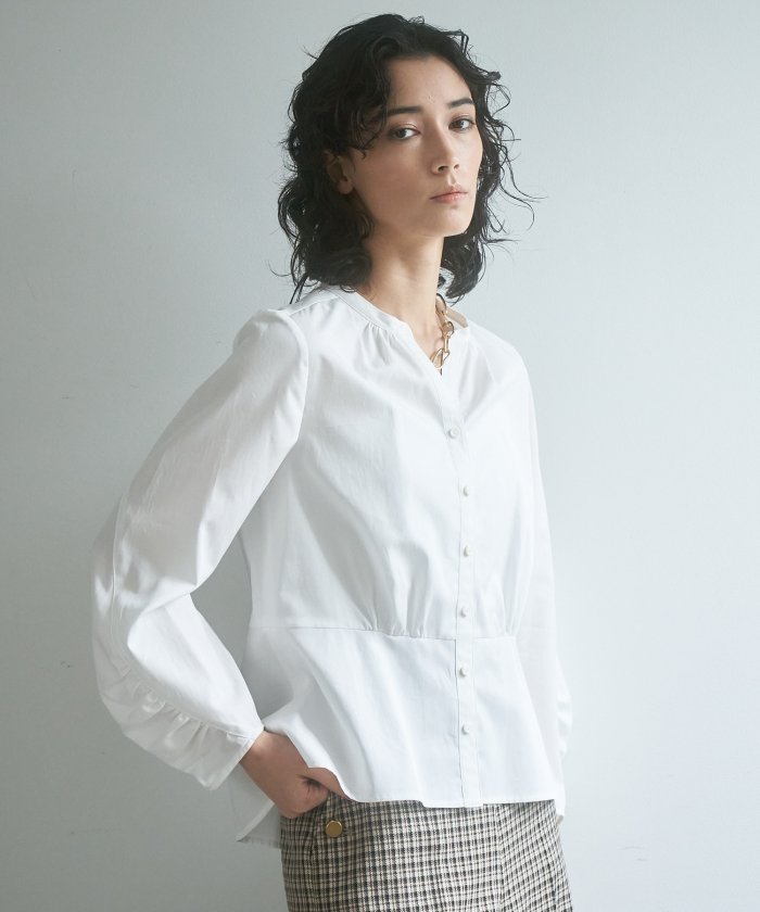 袖のシーム切替にギャザーを施したデザインスリーブは着用した時に美しいラインを描くような仕上がり。スキッパーの胸元で程よい抜け感を、ペプラム切替の身頃が1枚でボトムアウトして着用するだけでスタイリングが完成。 付属:なし 裏地:なし 透け感:ホワイトのみややあり 伸縮性:なし