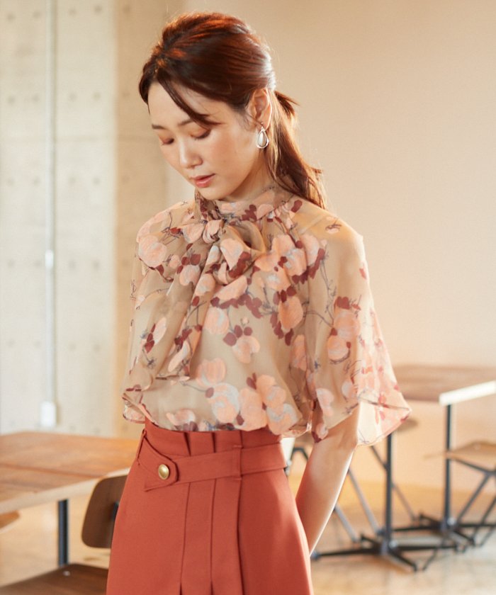ペイントフラワープリントボウタイ ブラウス