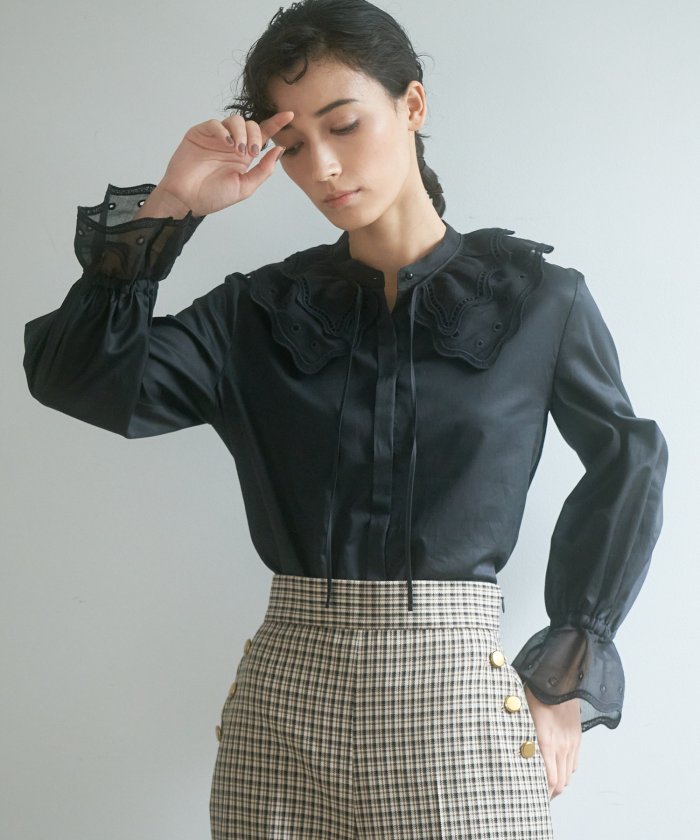艶のあるコットンサテンと、襟と袖にはコットンシルクのエアリーなオーガンジーを使用したブラウス