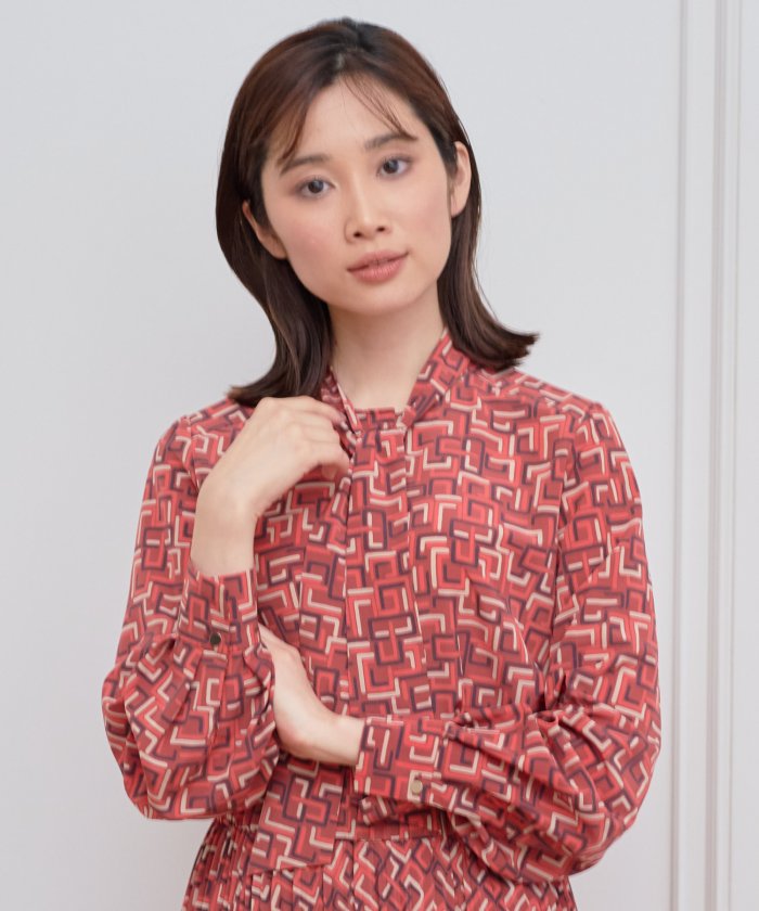 程よい落ち感のあるデシン素材に、レトロ調の幾何柄をプリントした素材のボウタイ付きブラウス