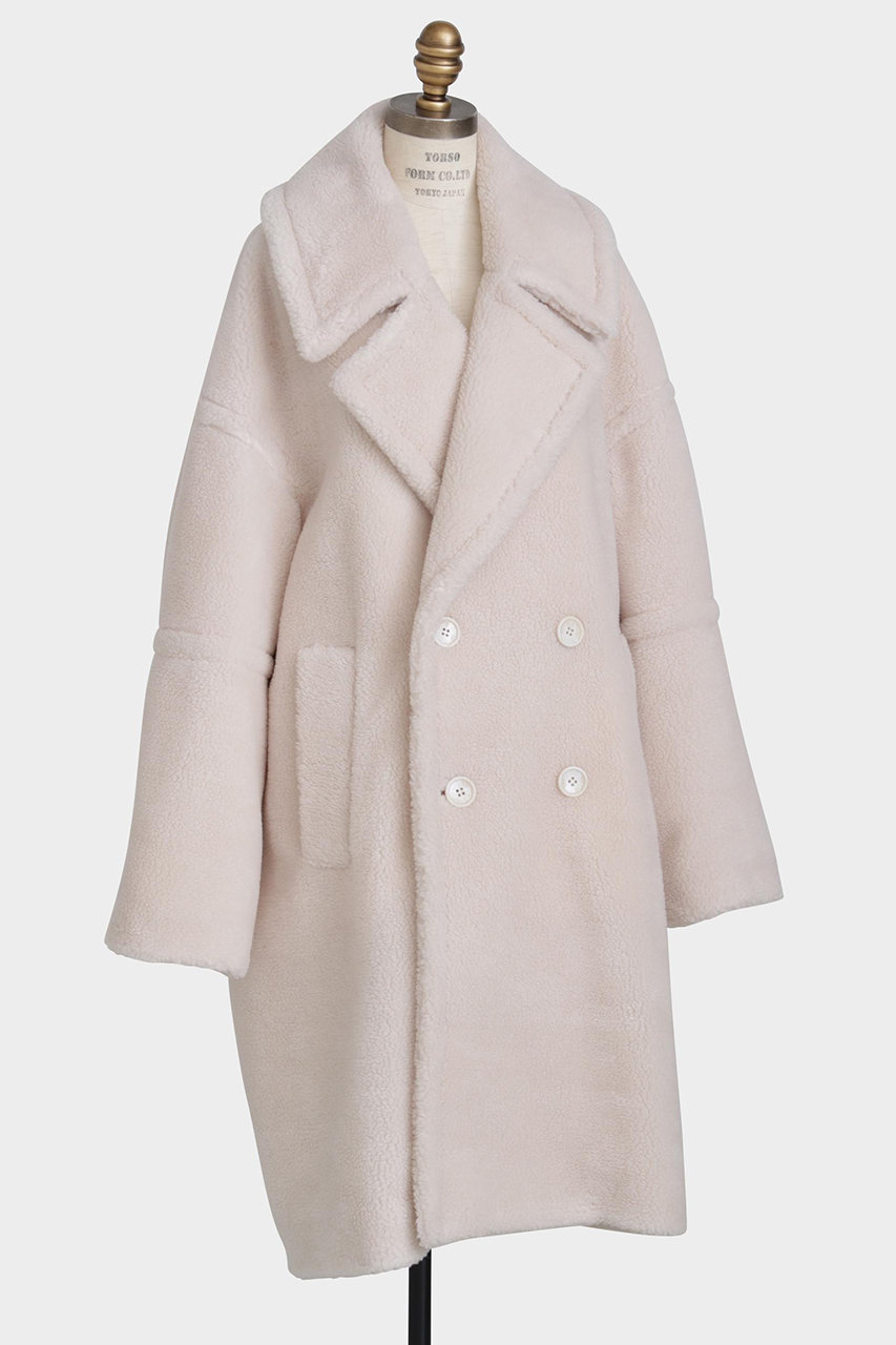 オーバーショルダーがポイントのダブルブレストコートに、裾に施されたフェイクファーでアクセントをプラス