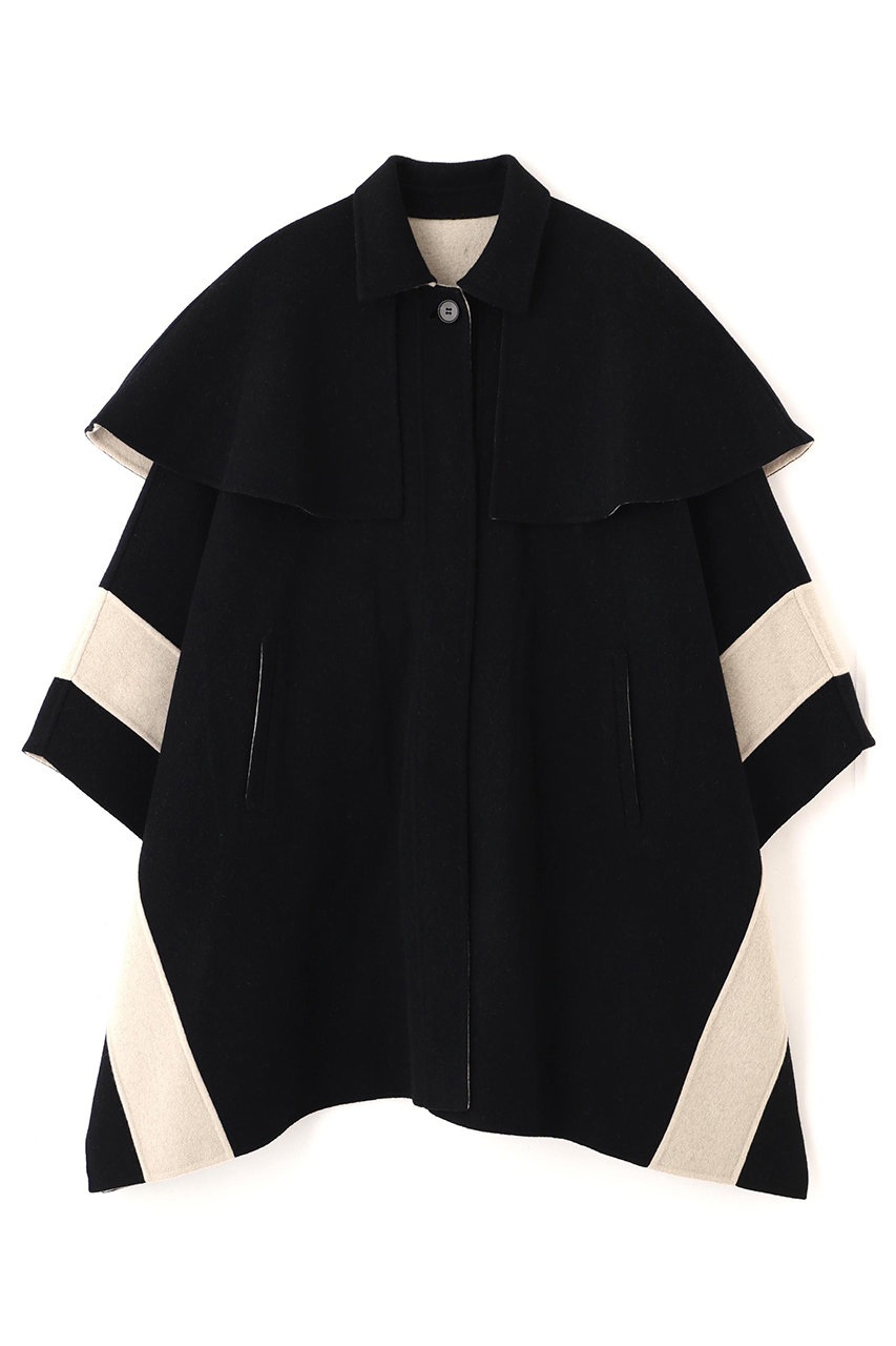 シンプルなスタンドカラーコートの上にケープをレイヤードしてモードに仕上げたアイテム。ケープは雰囲気を変えて楽しめるリバーシブル仕様。端のボタンを止めて袖口風にしたり、中心をずらして斜めに羽織ったり、左右を短くしてジレ風に、とアレンジは自在。それぞれを別々に着られるのも◎。