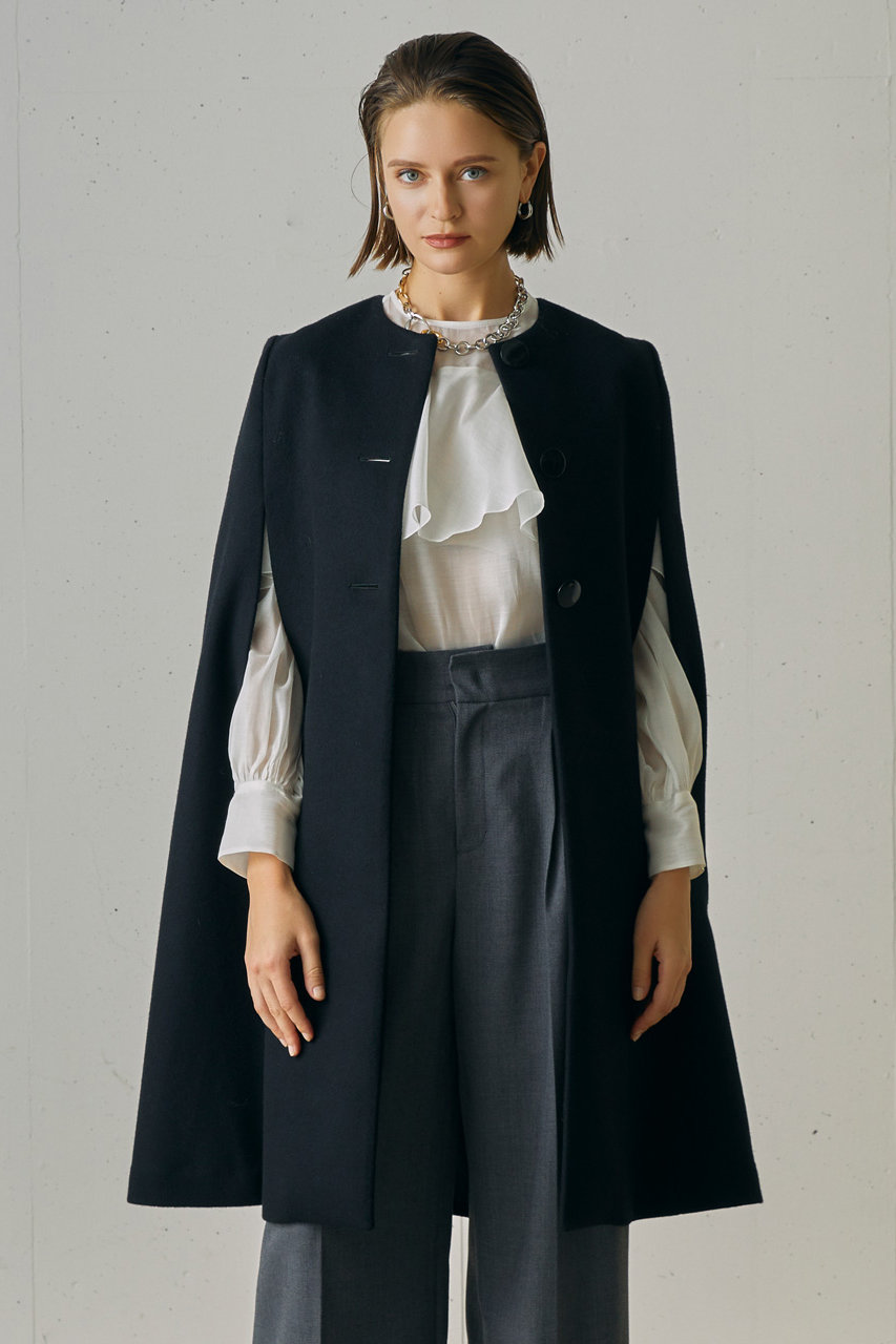 裾に向かって広がりのあるシルエットがレディ度を高める本格的なケープコートが仲間入り。光沢の美しい柔らかな生地をたっぷり使いリュクスなムードをオン。アンティーク調のゴールドボタンがリッチなムードを放って。デイリーユースはもちろん、オケージョンシーンなどのドレスアップスタイルに取り入れるのもおすすめ。