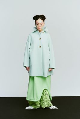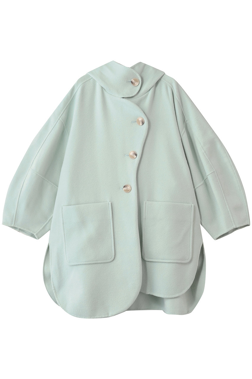 切替を利用した丸みのある立体的な袖や前あきや裾のアシンメトリーなサークルカッティングなどデザインが詰まった他にはない遊び心あるモッズコート。全体的に丸みを帯びたデザインは、やさしい女性らしい印象に