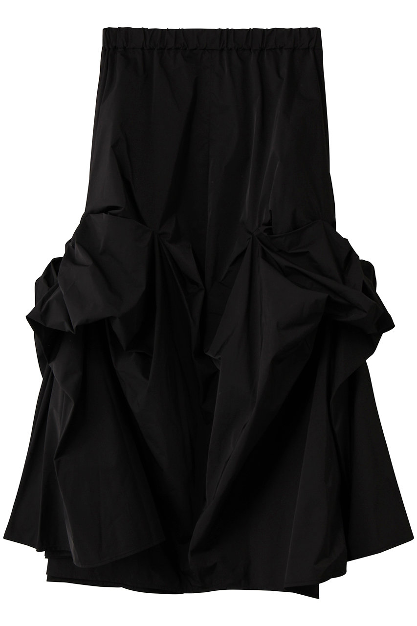 分量をたっぷり使用したリボンを思わすタックディティールのスカート。単純なリボンではなくフレアシルエットに紛れるような施し方で、サイドから流れるフレア感によりどの角度からも美しく見えるように仕上げ