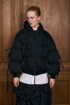 リボンが付いた椅子のクッションをイメージしたダウンジャケット。1枚でインパクトのあるデザインながら着用しやすいルーズなシルエットにフードタイプ。