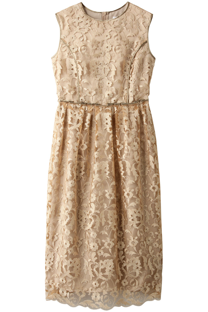 光沢感のある生地に透け感のある繊細なフラワーレースを重ねて華やかに仕上げたノースリーブワンピース。コンパクトなトップスと高めのウエスト切り替えでスタイルアップ効果も抜群。キレイめなお出掛けやパーティに大活躍してくれそう。