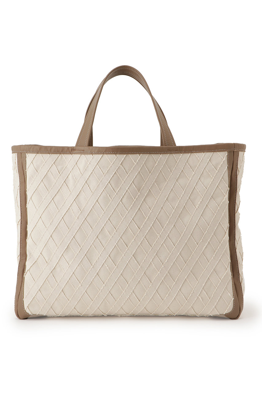 キャンバスを格子状に縫い合わせたオリジナル素材の新作トートバッグ。レザーのパイピングがあることでカジュアルになりすぎず、幅広いコーディネートに合わせられるアイテム。A4サイズやPCはもちろん、荷物がたっぷり入るサイズ感が◎。