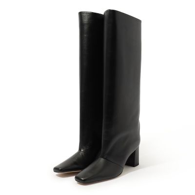 シャープなスクエアトゥと安定感のあるチャンキーヒールが目を引く、モードな佇まいのロングブーツ。すっきりとした縦のラインが脚をまっすぐに美しく見せ、スタイリング全体を引き締めます。存在感がありながらも取り入れやすく、洗練された印象を演出する一足。シンプルなコーディネートに合わせるだけで、モードなエッセンスをプラスしてくれます