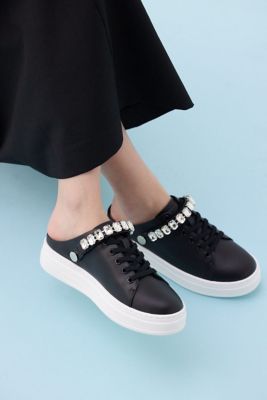 大ぶりのビジューストーンベルトが、カジュアルになりがちな足元を上品で華やかな印象に。ベルト部分は、バックベルトでかかとを固定して履くことも、前ベルトにしてスリッポンタイプで履くことも可能。シーンや気分に合わせて楽しめる一足