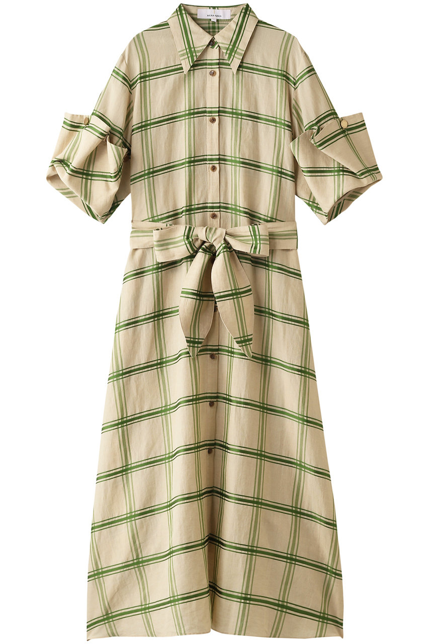 今季もワードローブに加えておきたいシャツドレスを「アキラナカ」流にブラッシュアップ。優しい雰囲気をもたらすチェック柄やさらりとした素材使いが好印象な1着。折り返したエレガンスなスリーブやウエストリボンが女性らしさを格上げ。前開きタイプだからライトアウターにも◎。