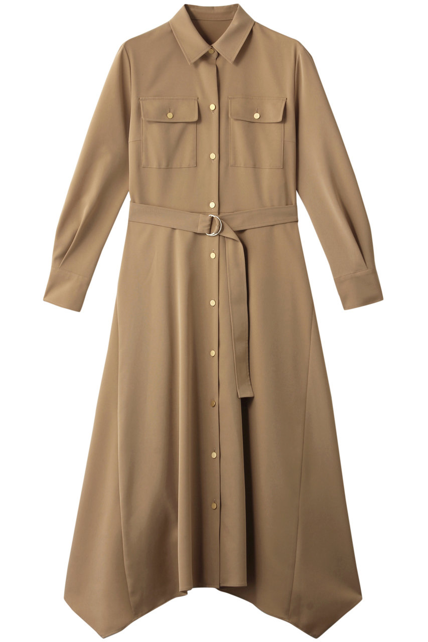程よい光沢感のあるツイル生地で仕上げた上品なシャツワンピース。ゴールドのボタンとイレギュラーな裾、ウエストのリングベルトが華やかなアクセントをプラス。ストレッチ素材で着心地も抜群。デイリーからキレイめなお出掛けまで幅広いシーンで活躍してくれそう。