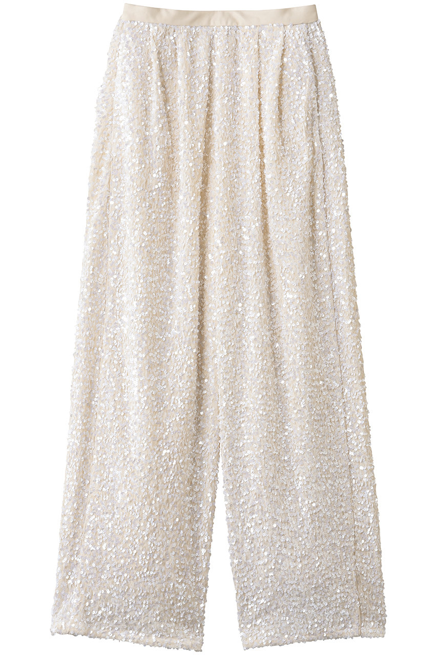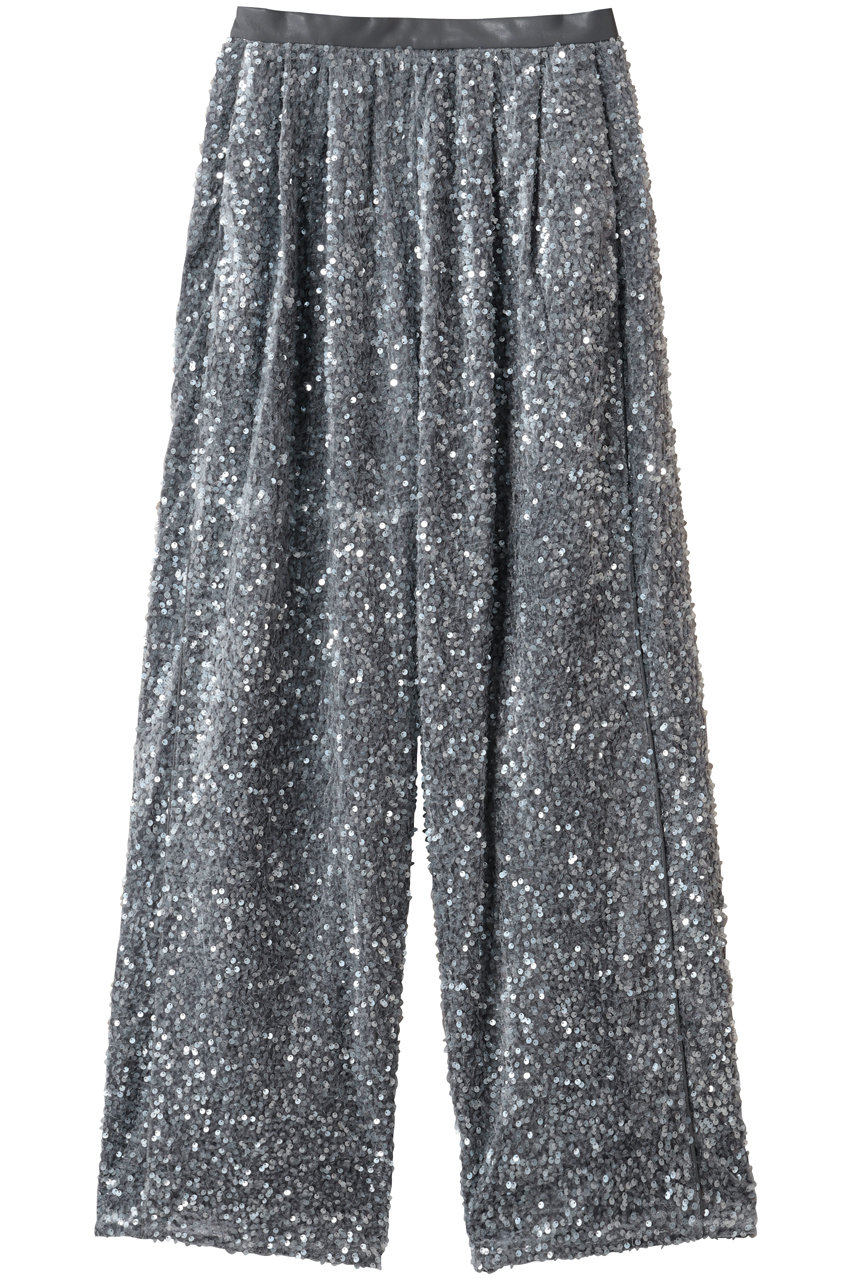 ー Style ーキラキラと輝くスパンコールがインパクト大のパンツ。2タックの太めのテーパードレッグ。ルーズなシルエットでリラックス感があり、スタイリングのアクセントになる1本。ー Fabric ーベロアのスパンコール生地。ウエストベルトと脇のパイピングはフェイクレザーでコントラストを付けているのもポイント。
